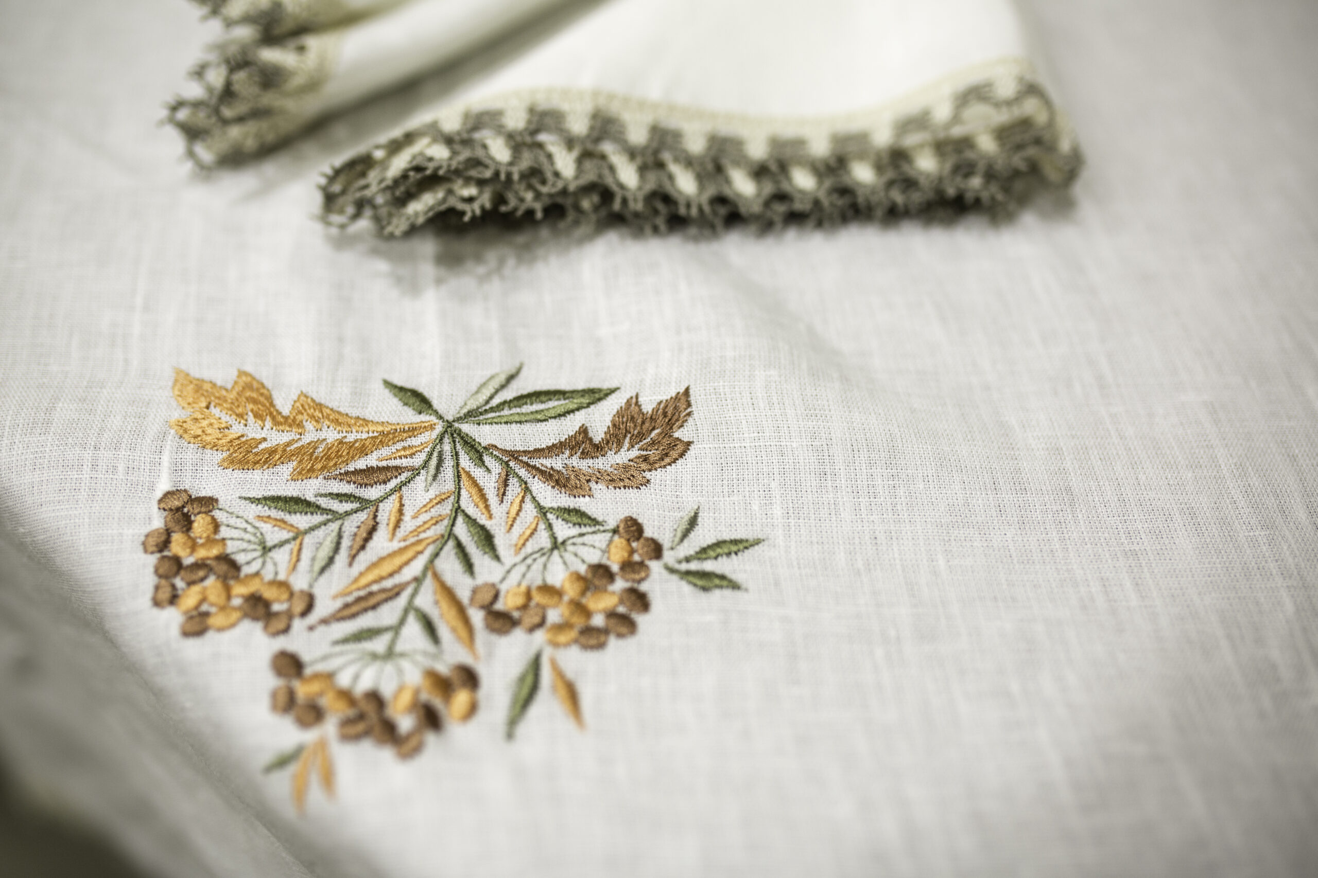 Столовый комплект с ягодами рябины, осенними мотивами, выполненный в теплой цветовой гамме.