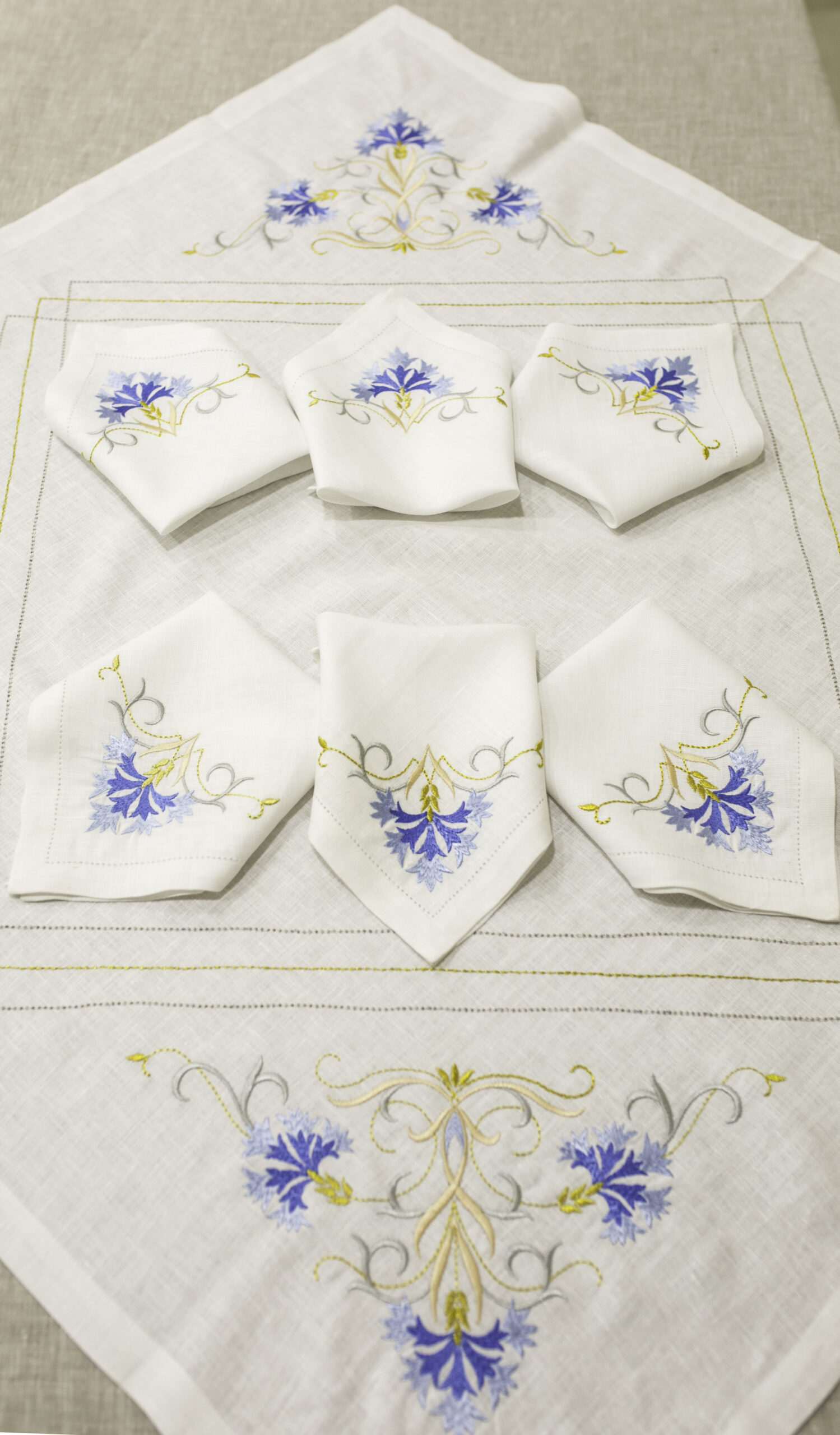 Комплект выполнен их 100% льна. Большая скатерть белого цвета со столешницей расшитой растительным орнаментом в охристо золотистой гамме. Столешницу и салфетки можно использовать как чайный комплект .