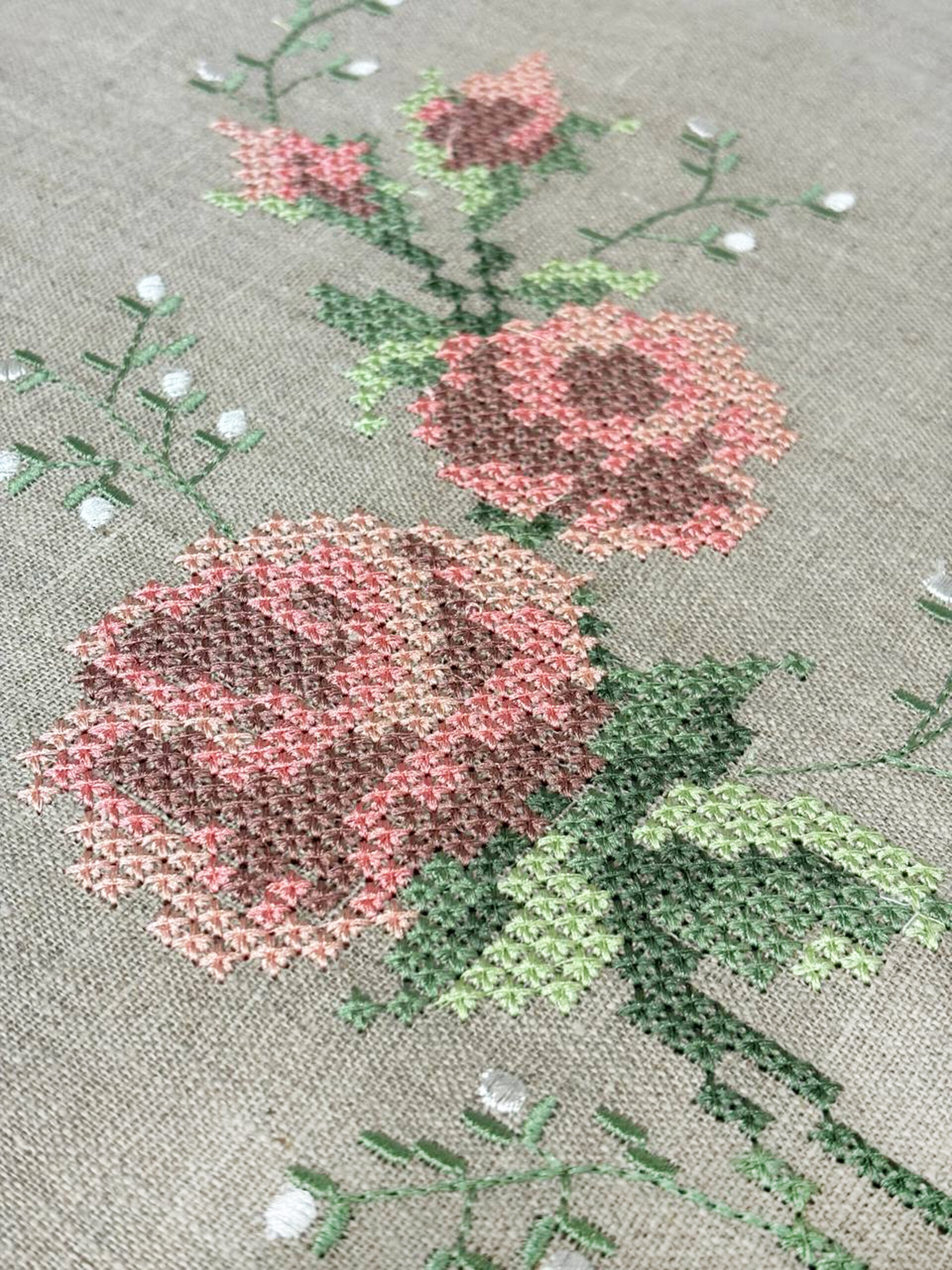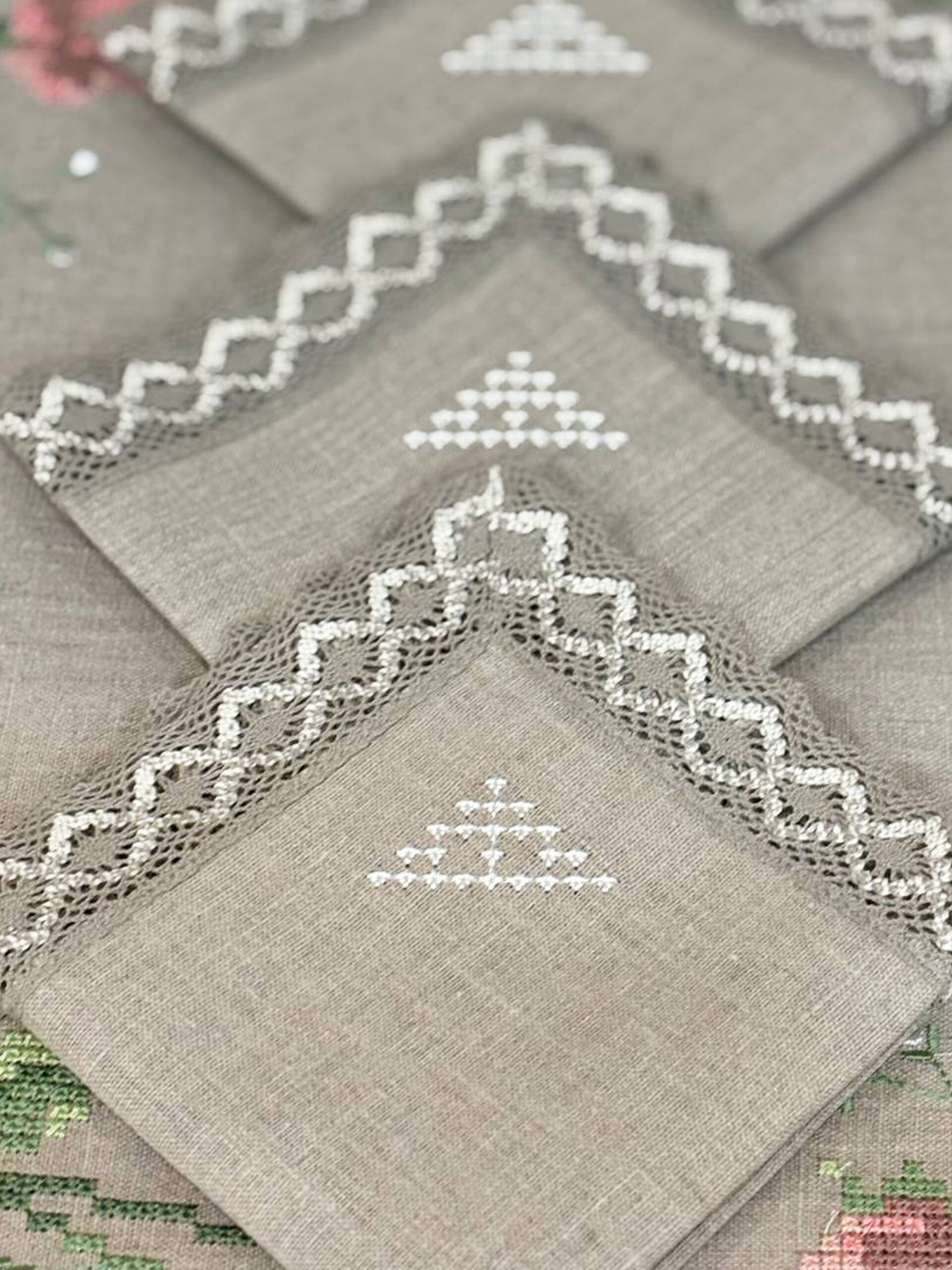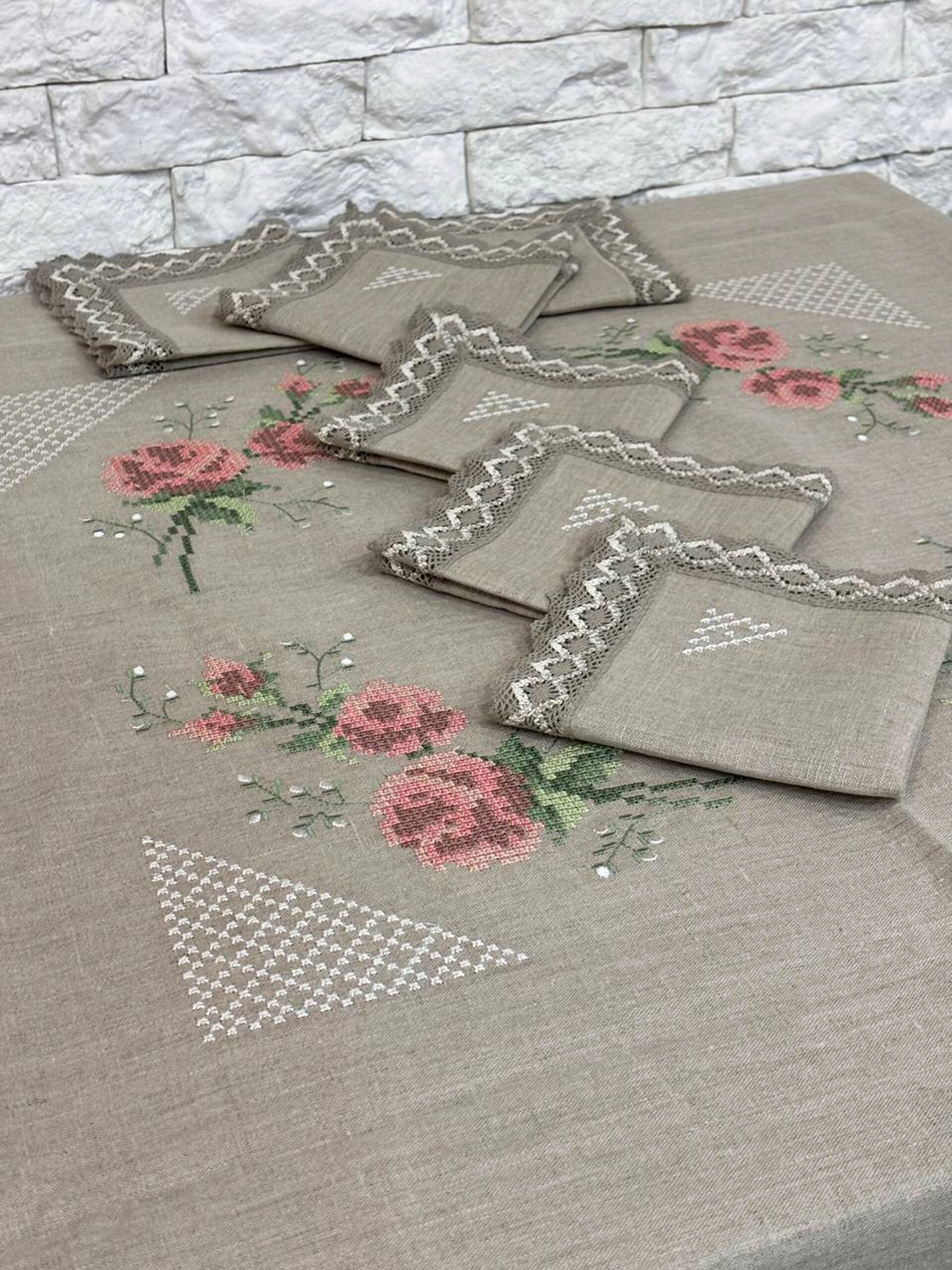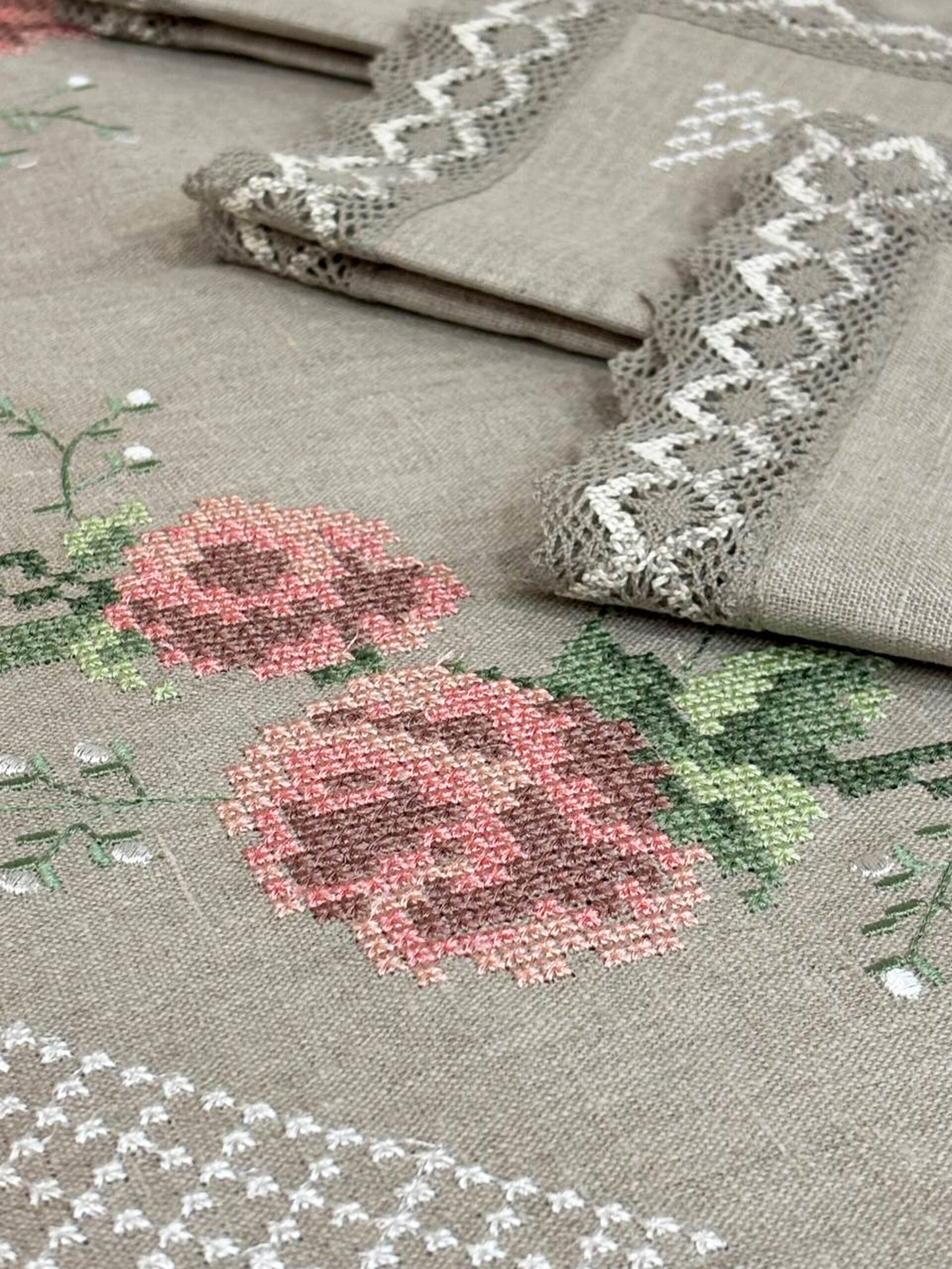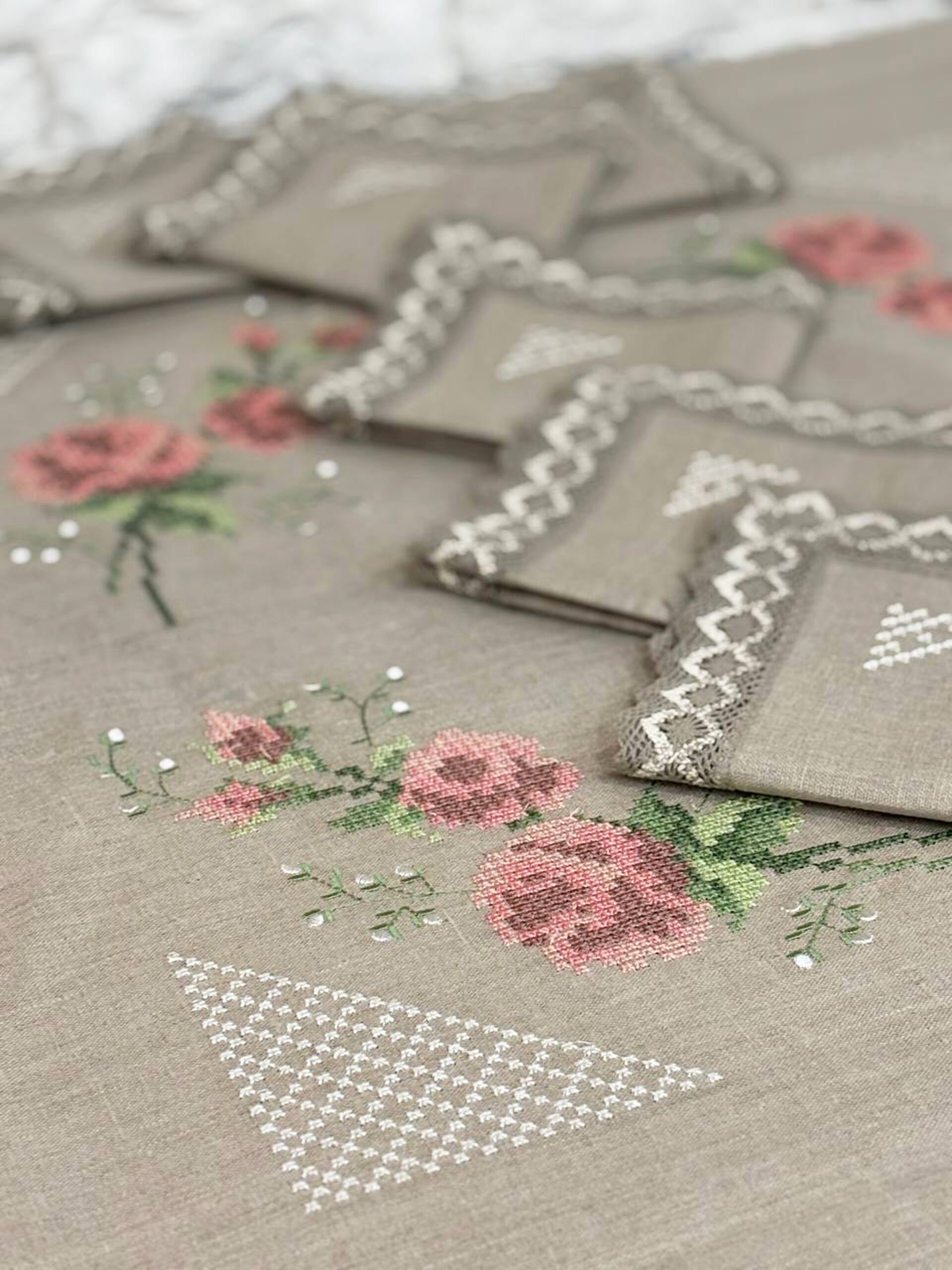 Скатерть выполнена из серого льна оттеняющего столешницу с кружевом и вышивкой белым по белому. Оттенки на столешнице достигаются направлением застила нити. Это создает ажурность и легкость комплекту.