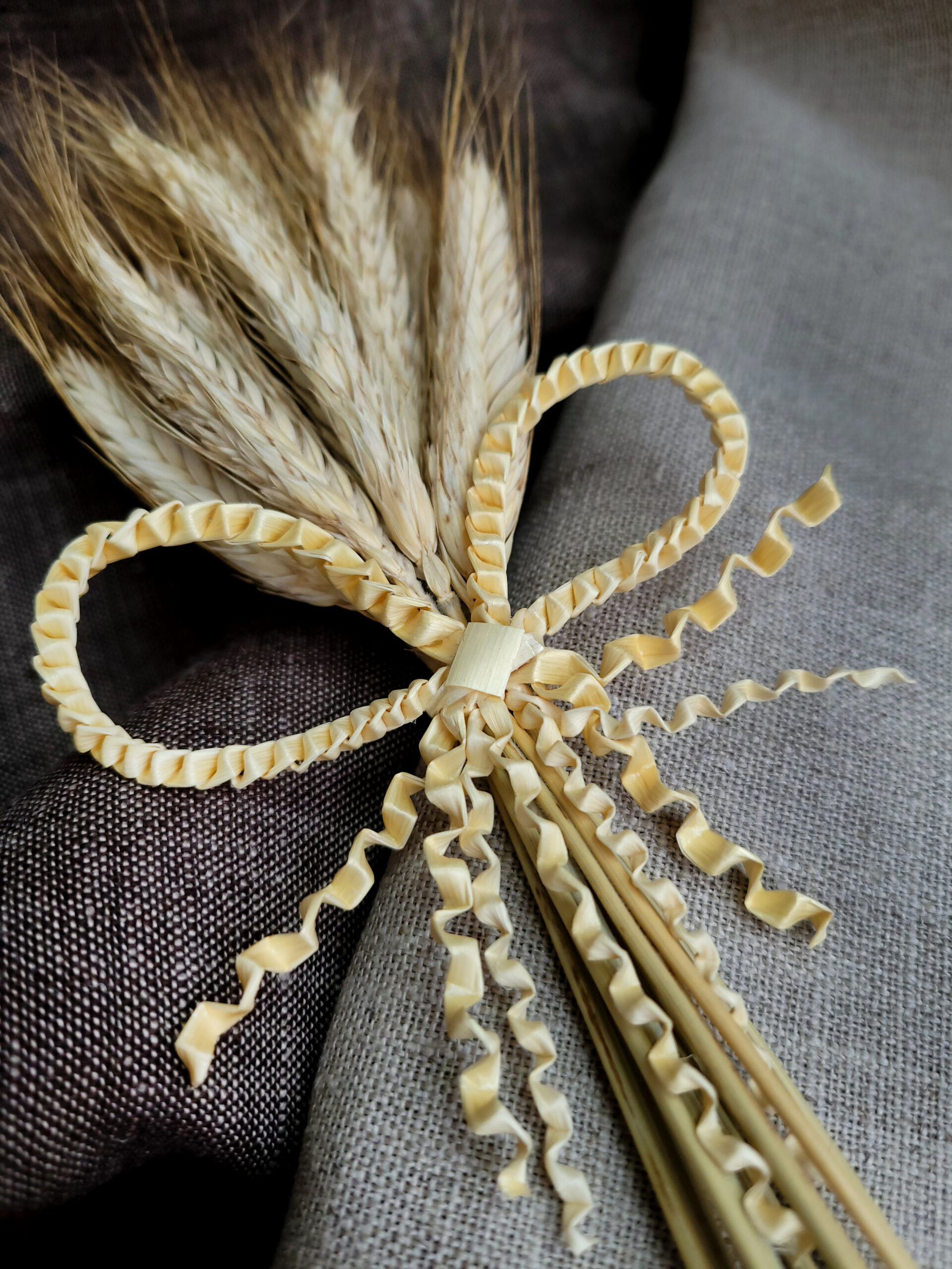 Скатерть выполнена из серого льна оттеняющего столешницу с кружевом и вышивкой белым по белому. Оттенки на столешнице достигаются направлением застила нити. Это создает ажурность и легкость комплекту.
